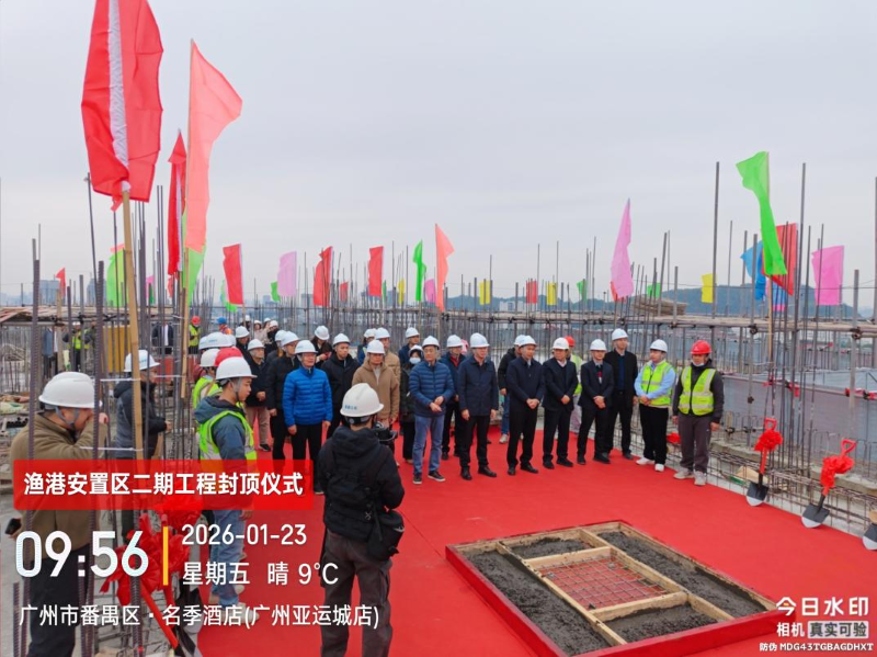 As a key livelihood project in Panyu District, the project covers a total land area of 10,754.91 square meters and a total construction area of 25,023.82 square meters. Upon completion, it will effectively address the resettlement needs of some fishing villages in the Shangxia Yong area, support the development of differentiated leisure fisheries and new-type fishing villages, and effectively promote the industrial transformation, reemployment and income increase of local fishermen. The successful capping of the main structure not only marks a critical phased achievement of the project but also demonstrates GDE’s professional management capabilities and effective project performance in the field of full-process engineering consulting.