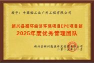 项目团队获业主单位新兴县新州能源开发投资有限公司颁发的“2025年度优秀管理团队”荣誉牌匾,业主单位对项目团队卓越的专业技术能力、高度的责任感和出色的执行力给予高度肯定,并将项目生产运营工作委托公司承接,实现再次携手、深化合作。